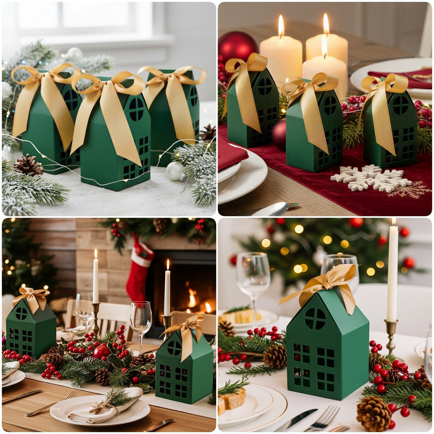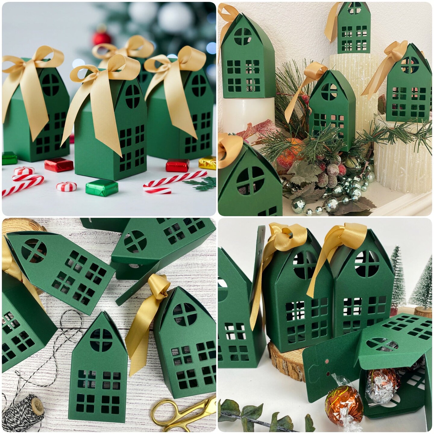Wrapables Festive Christmas House Shaped Gift Boxes with Ribbons for Weddings, Housewarming, Cookies, Candies, Treats, Party Favors (Set of 10), Green