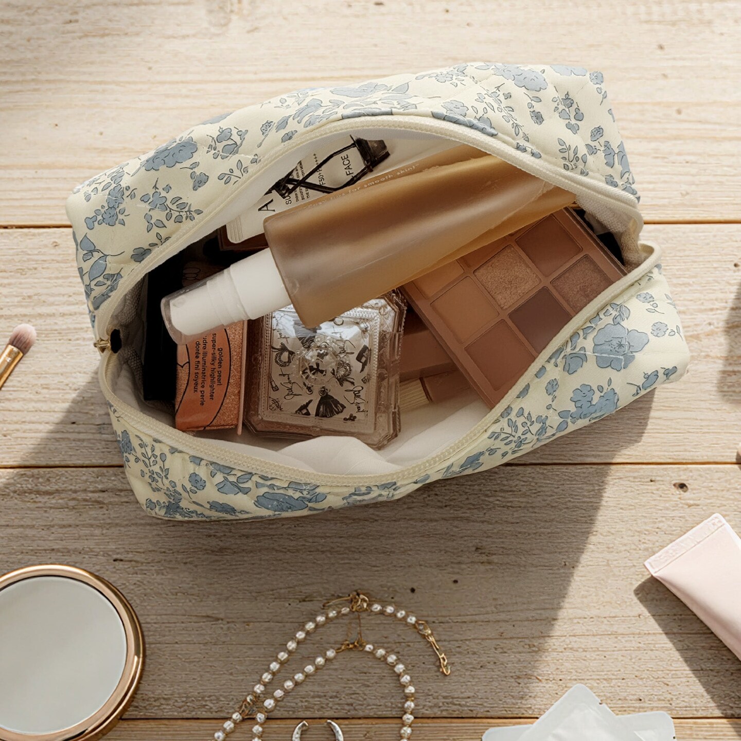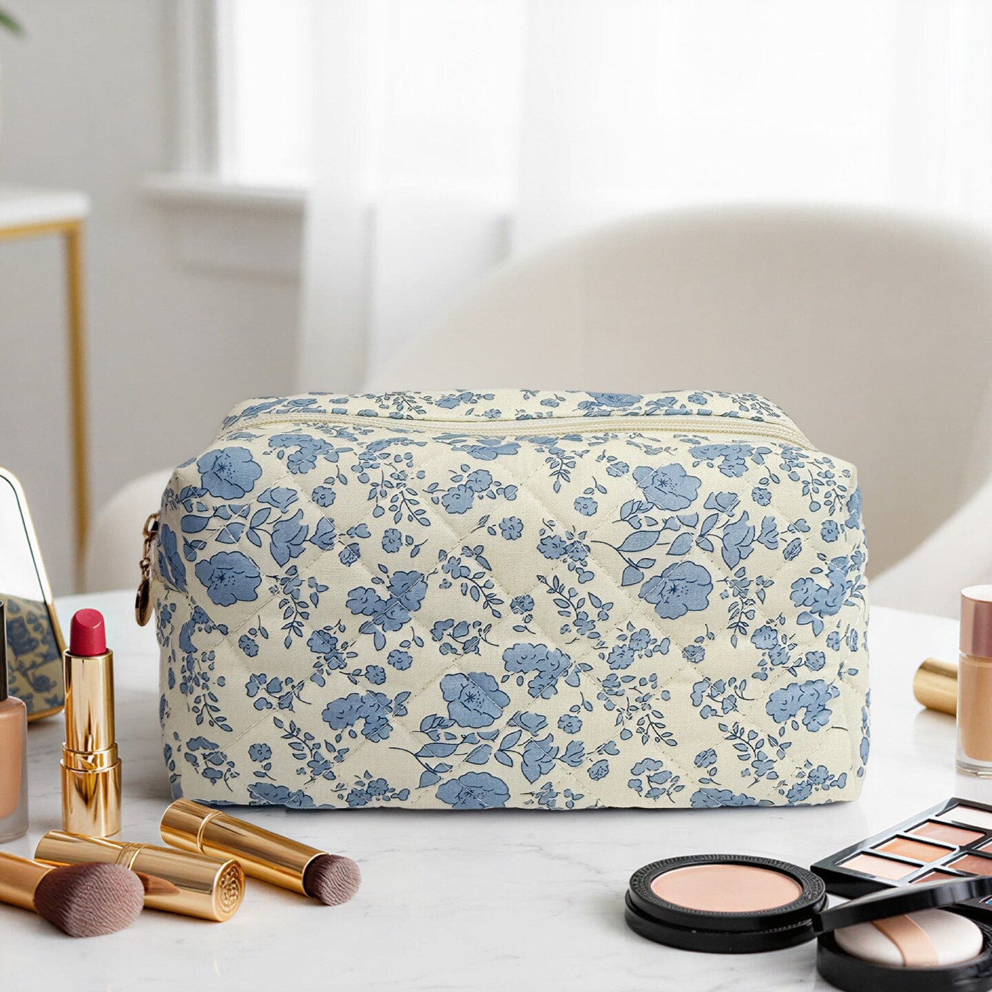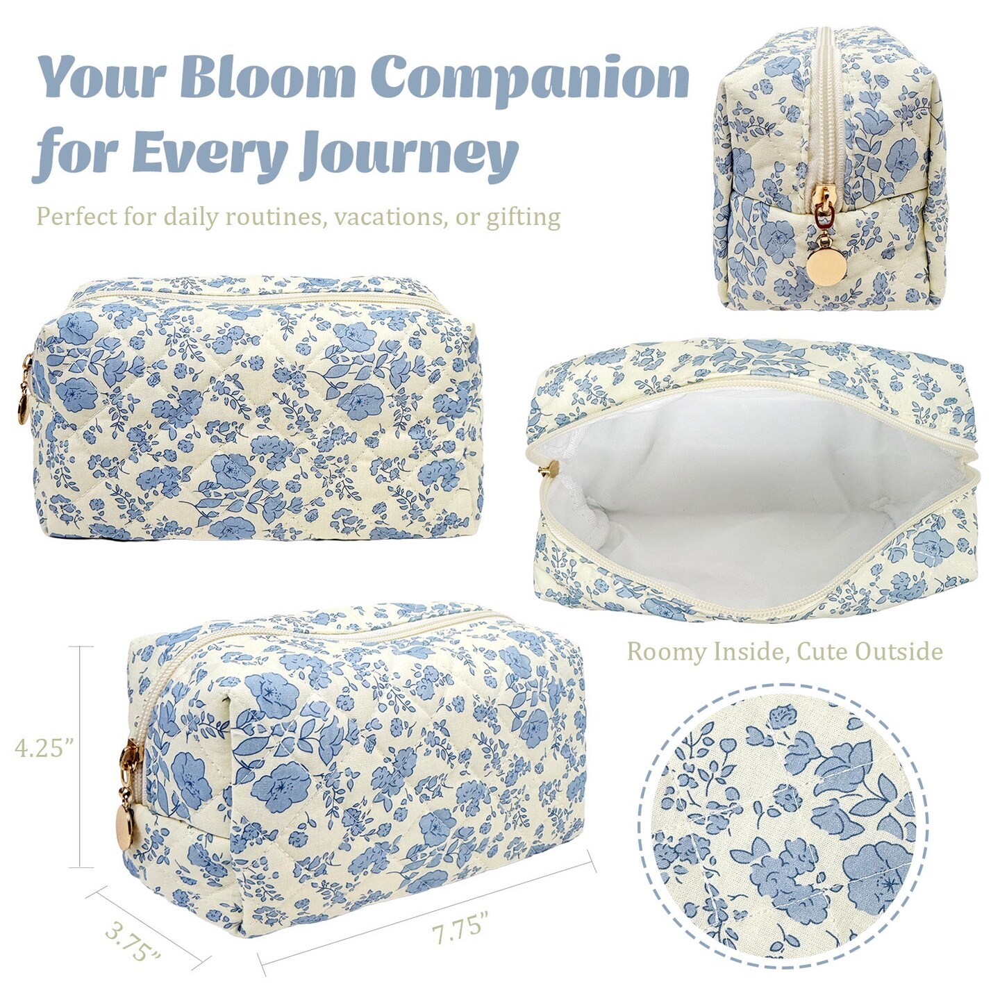 Wrapables Floral Quilted Makeup Bag for Cosmetics, Toiletries, Travel, Blue Cornflower