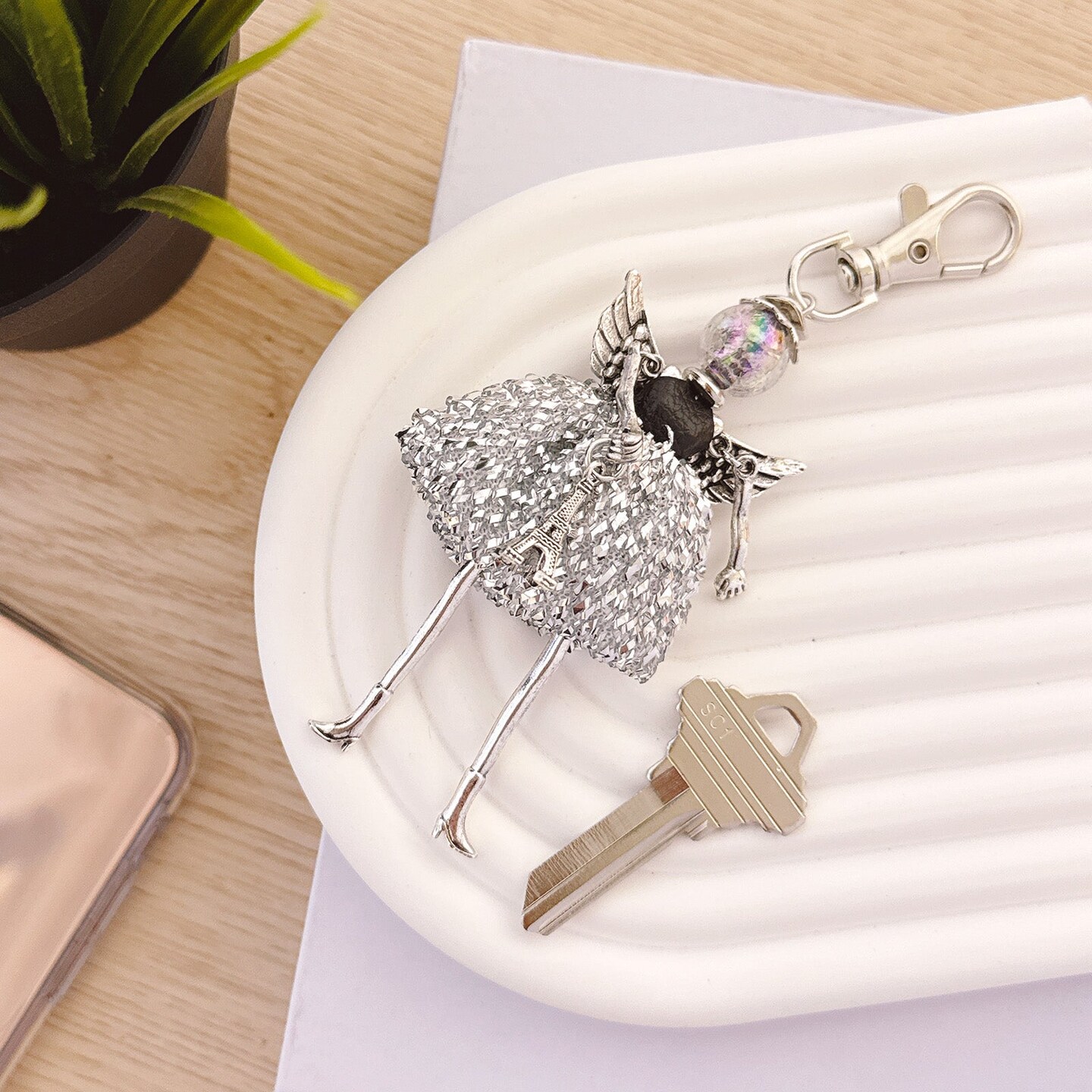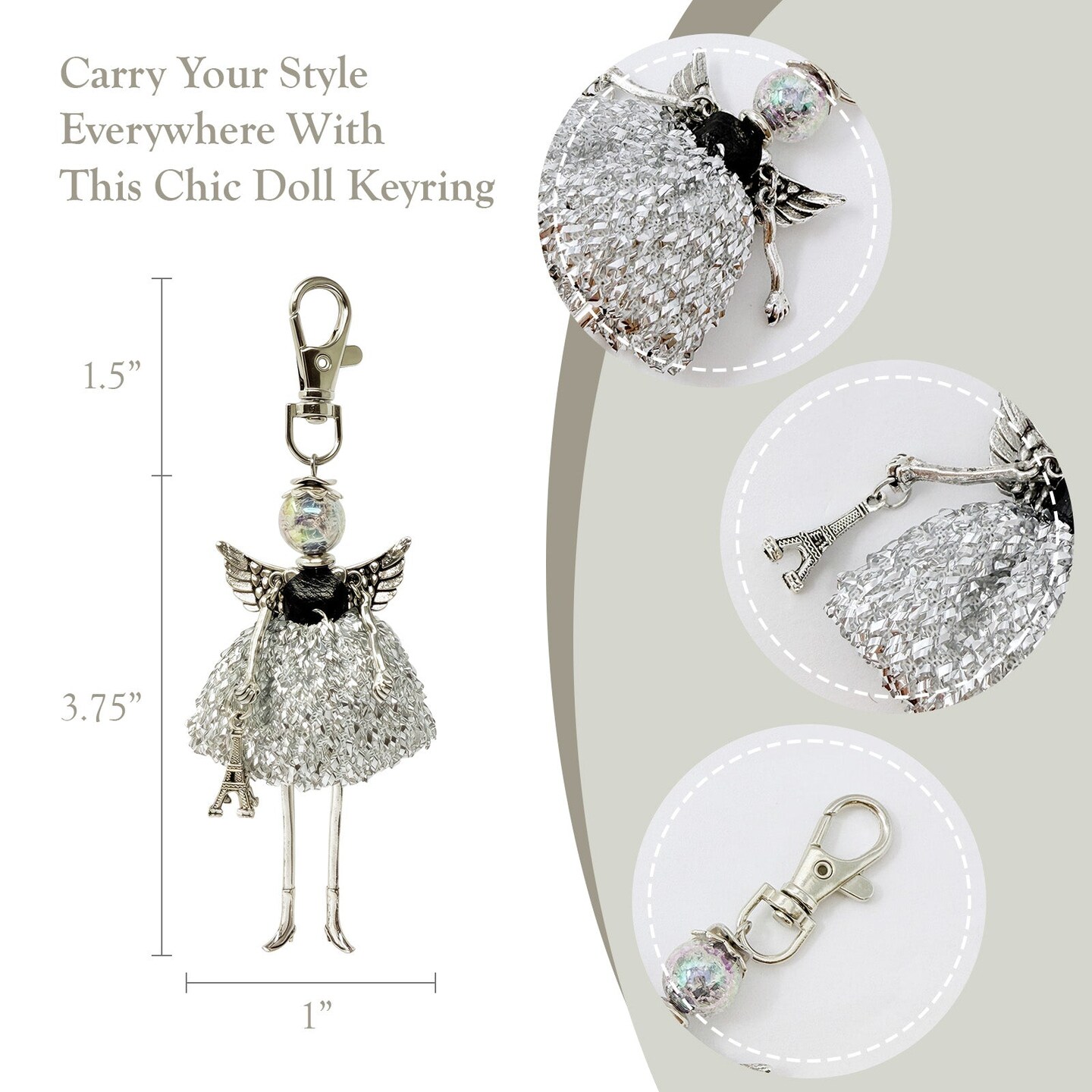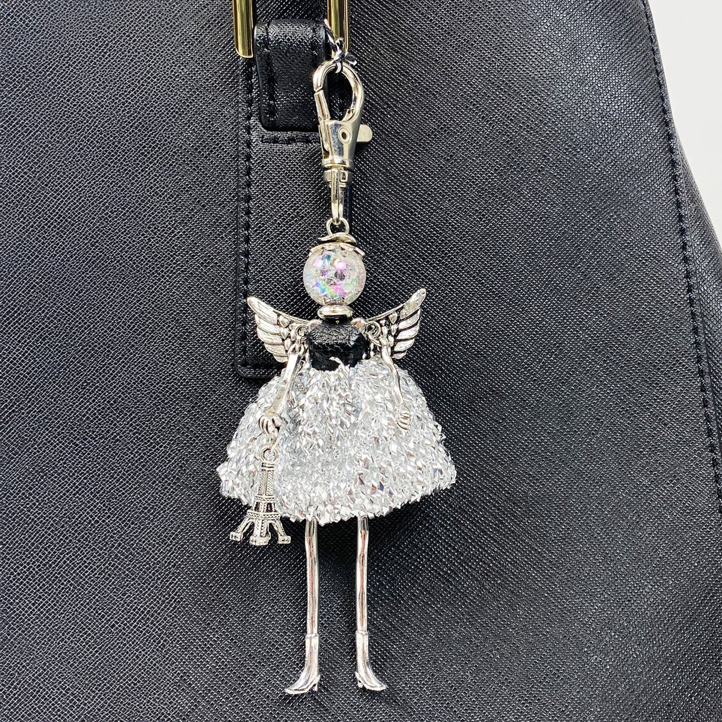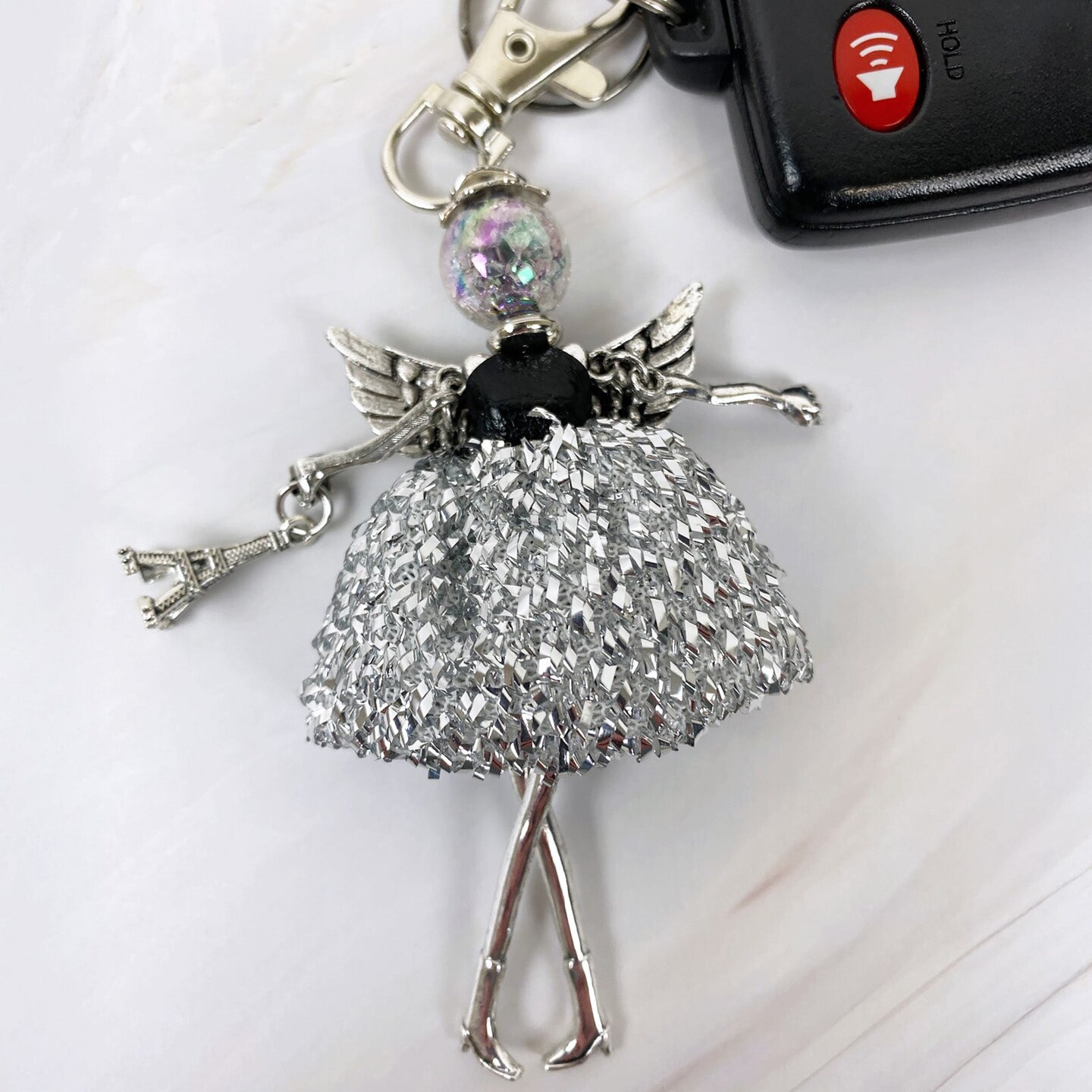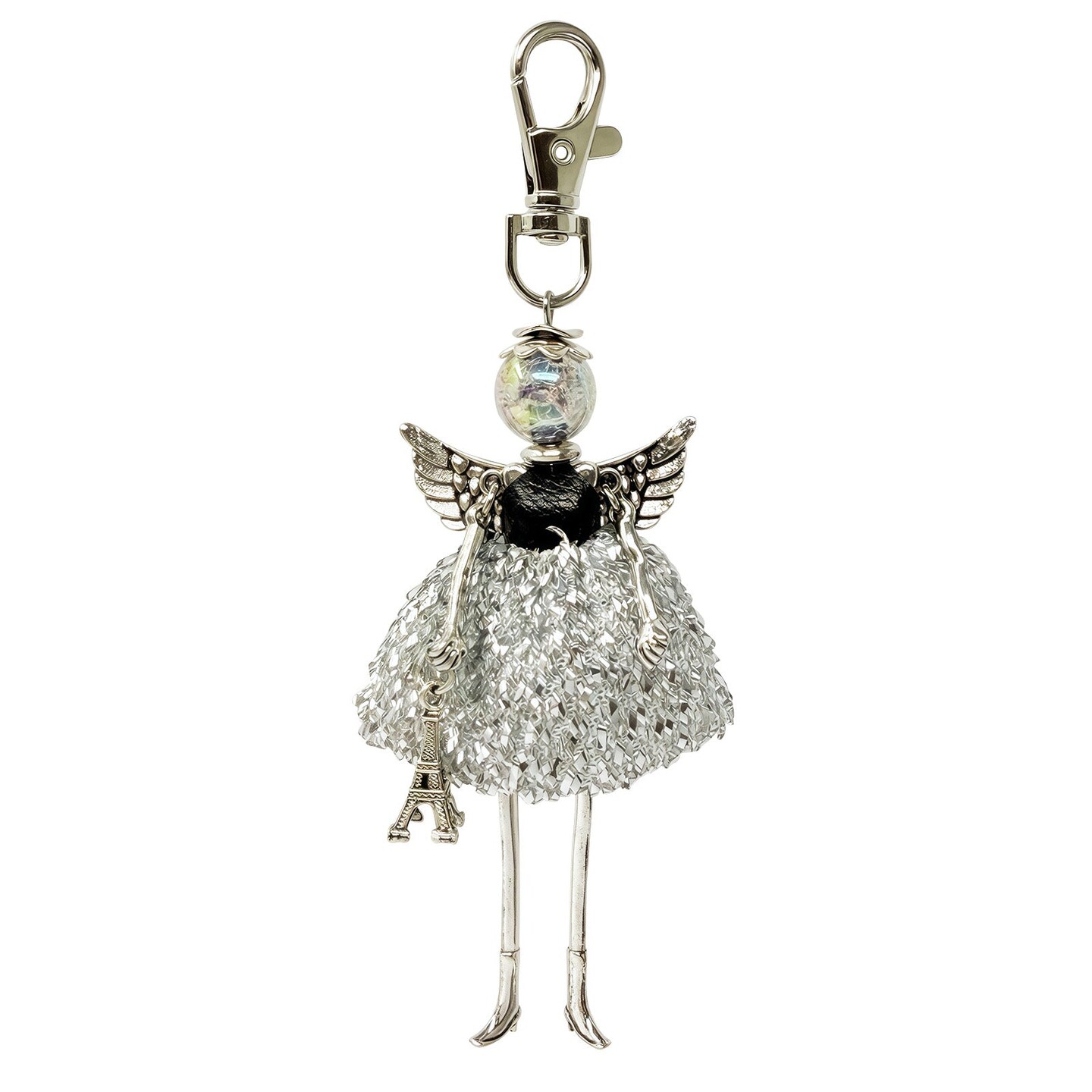 Wrapables Hanging Fashionista Doll Keychain, Crystal Rhinestone Keyring Bag Charm, Silver Angel