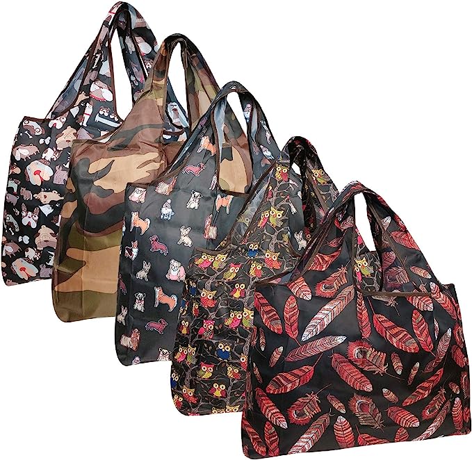 Wrapables Large Foldable Tote Nylon Reusable Grocery Bags, 5 Pack