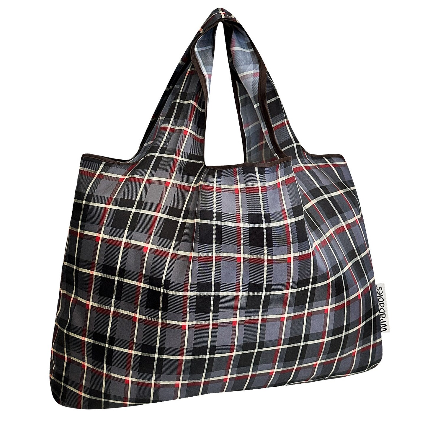 Wrapables Large Foldable Tote Nylon Reusable Grocery Bags, Black Plaid