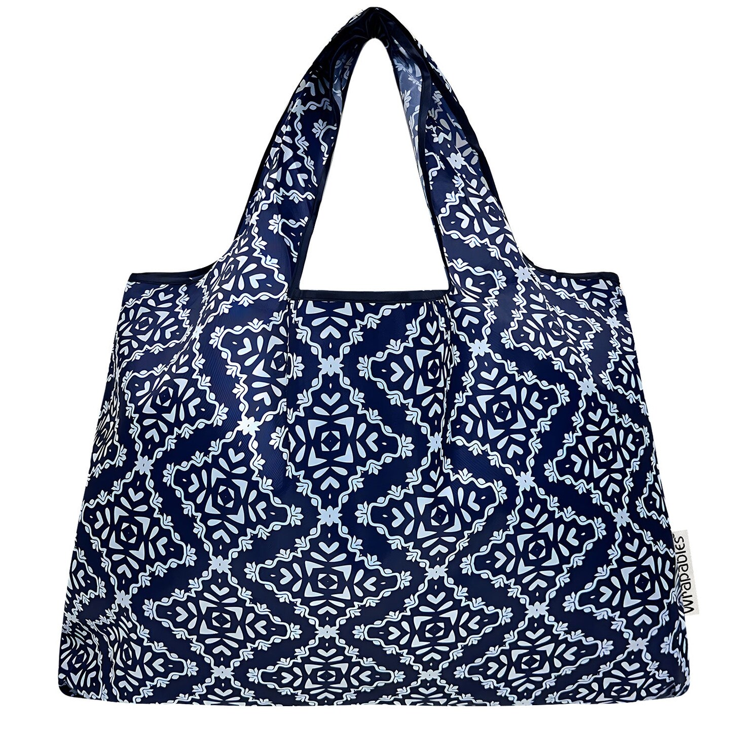 Wrapables Large Foldable Tote Nylon Reusable Grocery Bags, Navy Deco