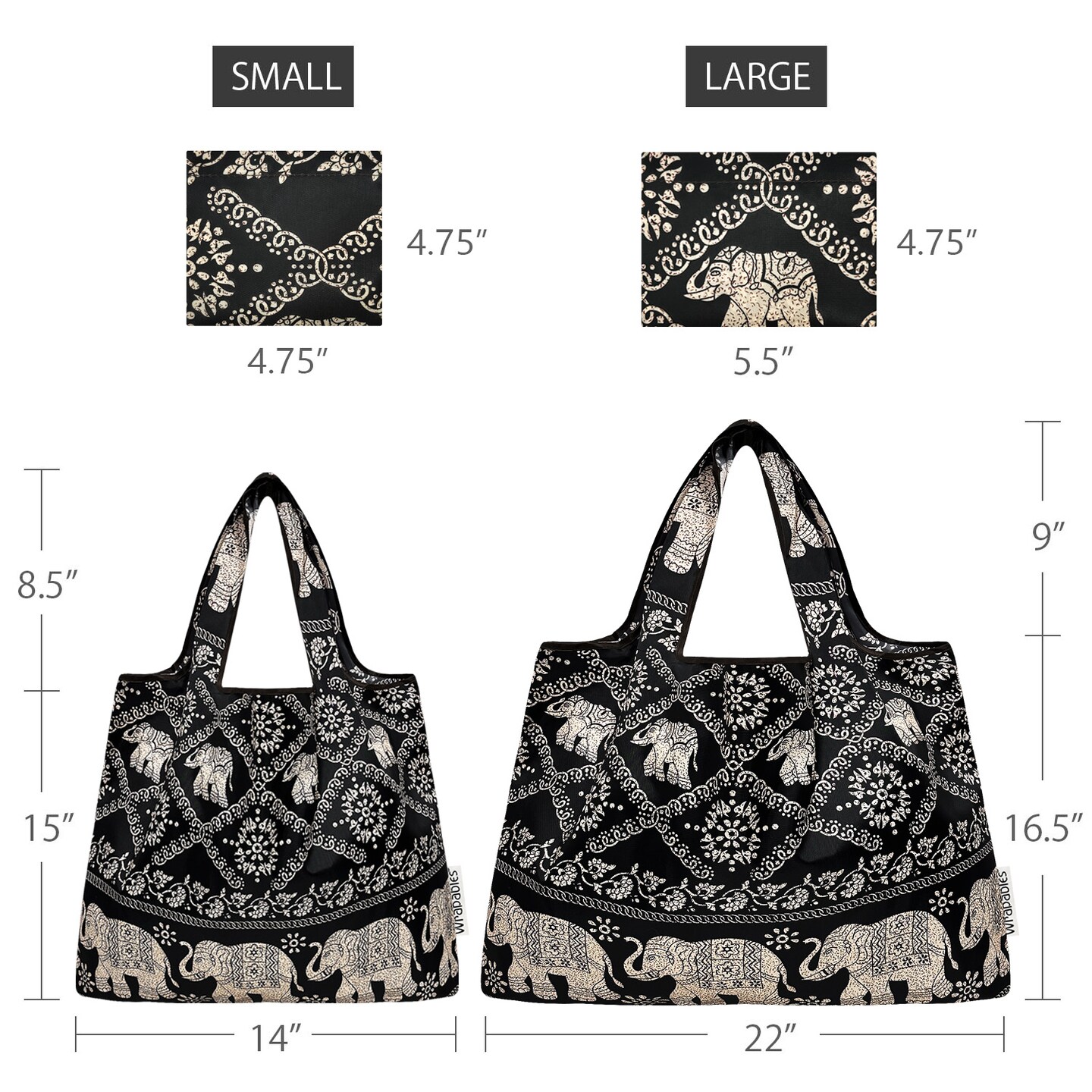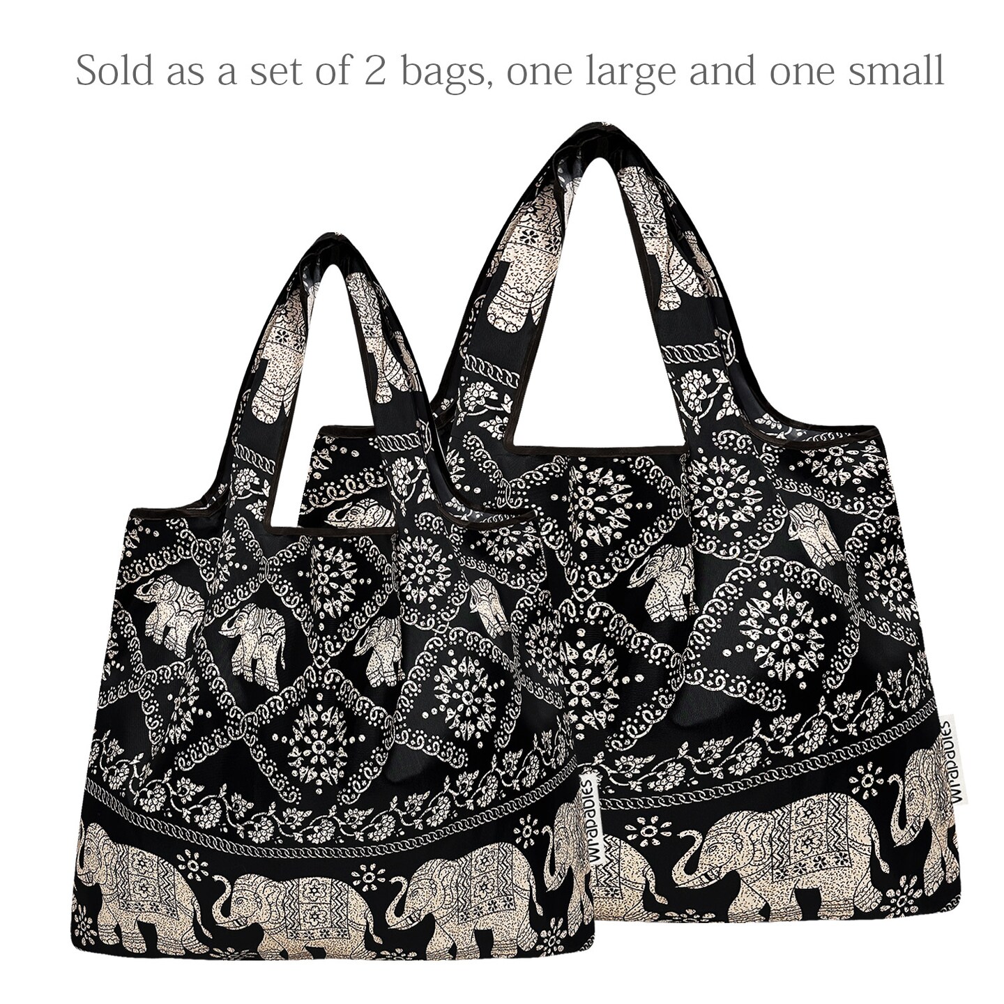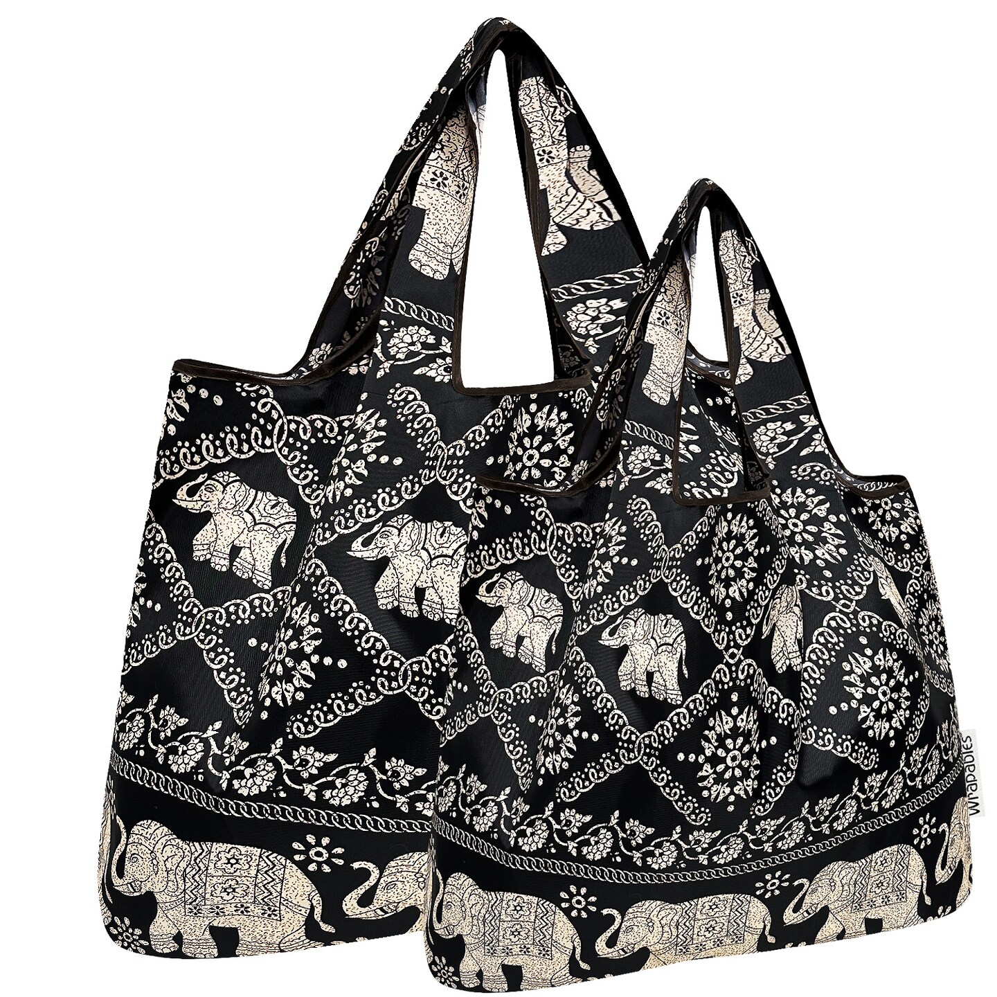Wrapables Large & Small Foldable Tote Nylon Reusable Grocery Bags, Set of 2, Black Regal Elephants