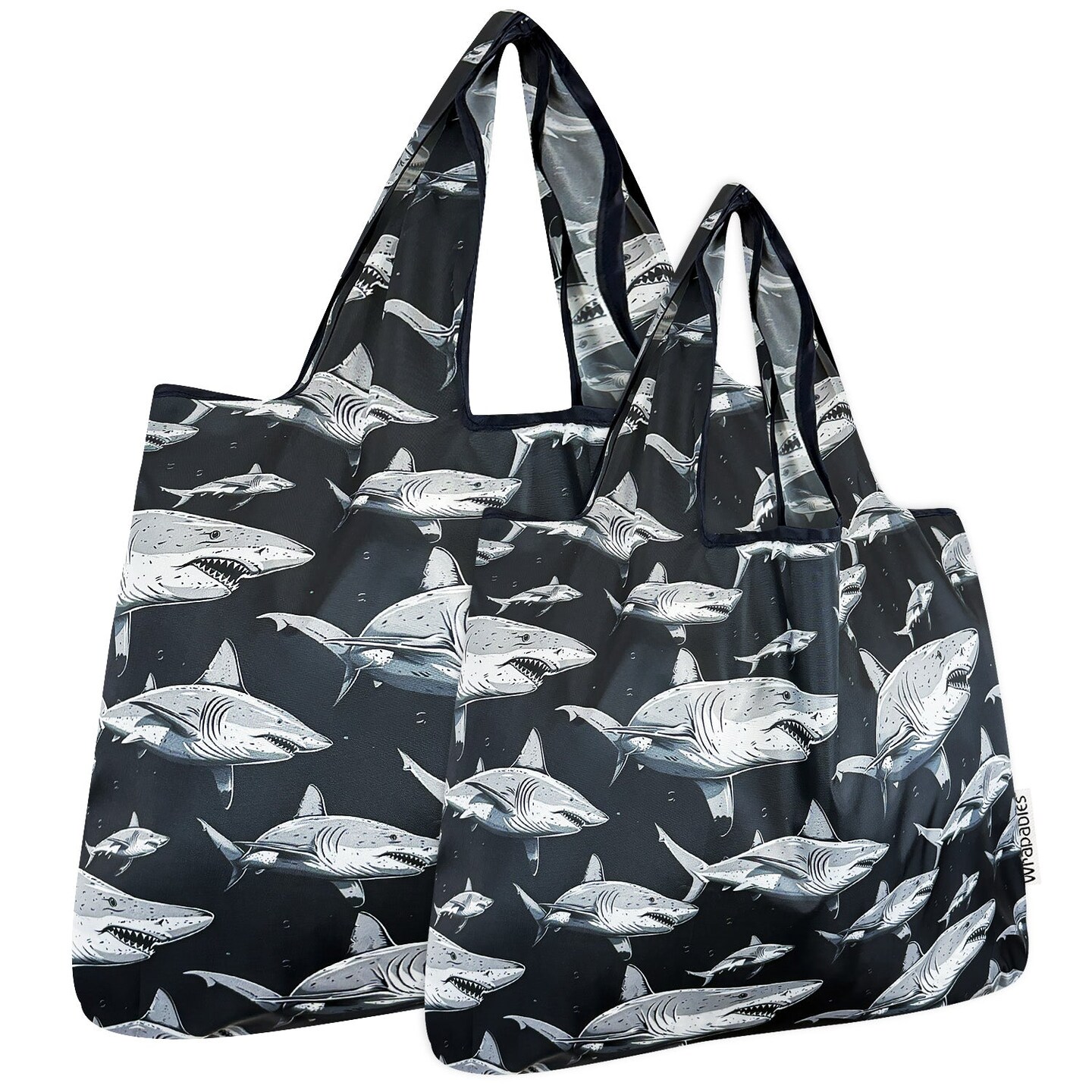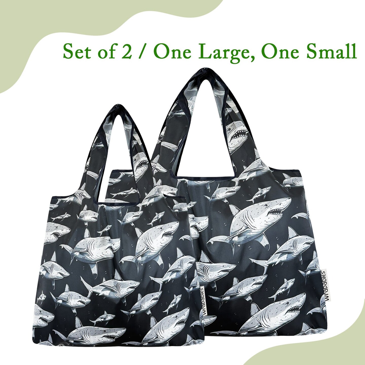 Wrapables Large & Small Foldable Tote Nylon Reusable Grocery Bags, Set of 2, Sharks in Black