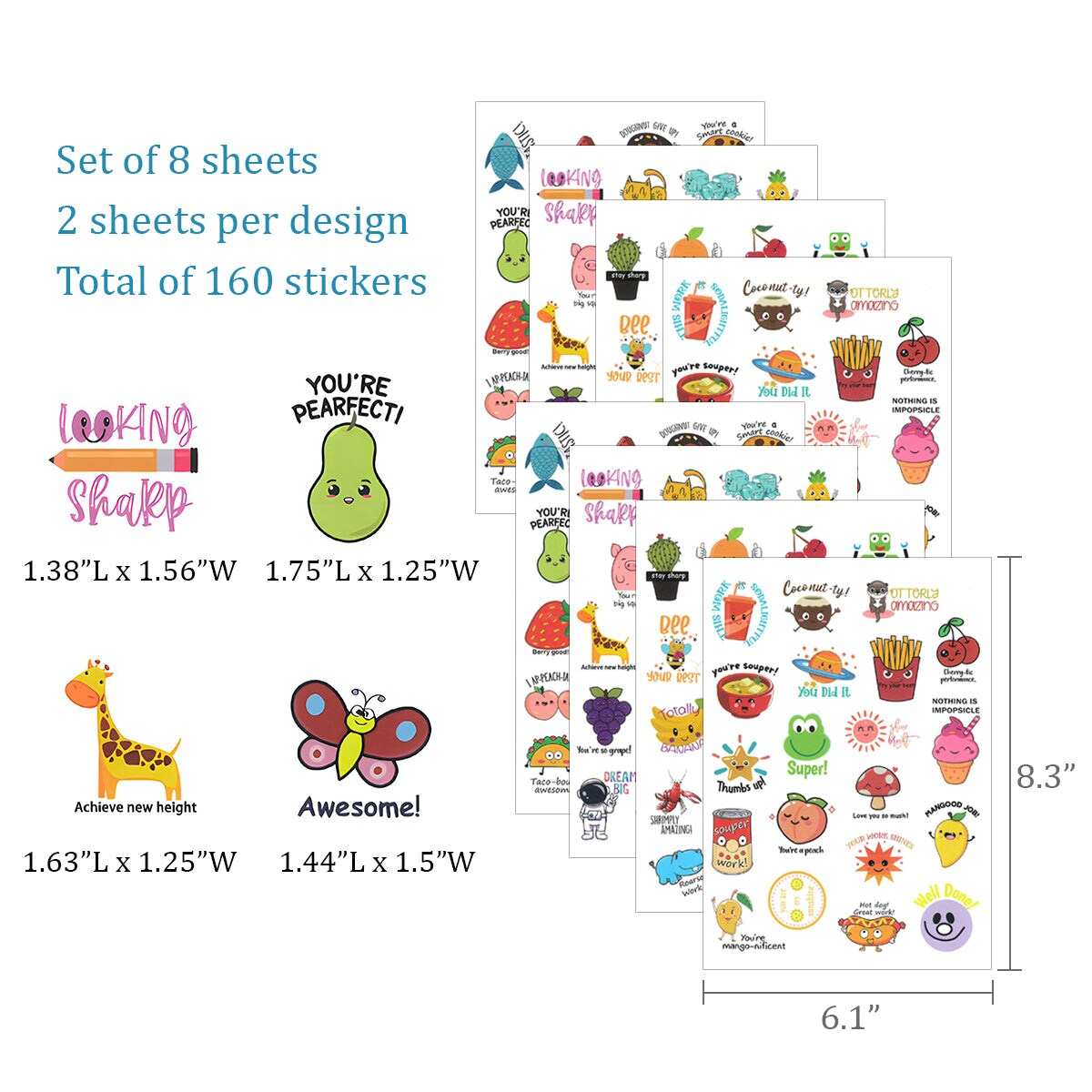 Wrapables Motivational Reward Vinyl Stickers for Teachers, Students, Classrooms 8 Sheets (160pcs), Food & Animals