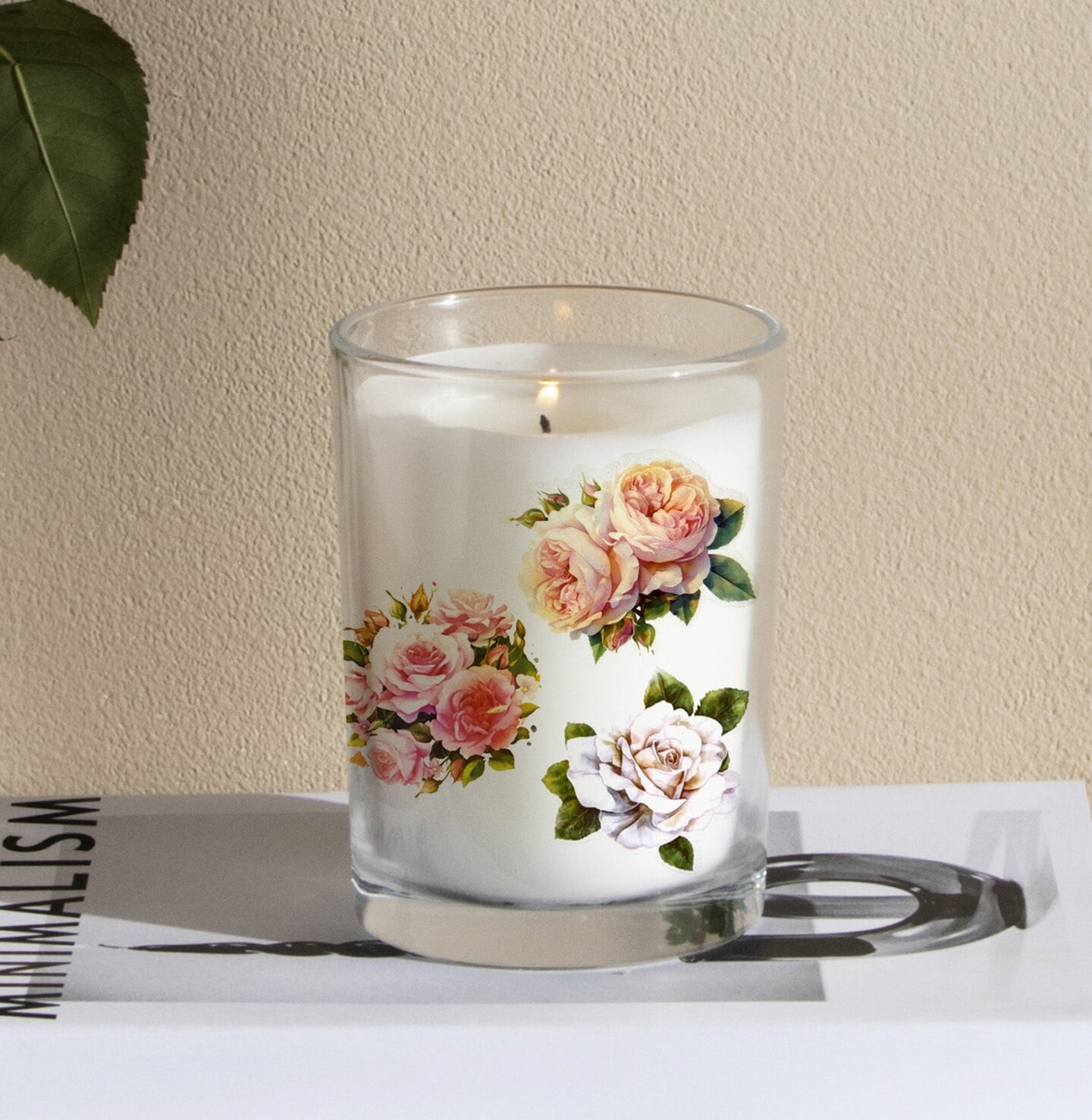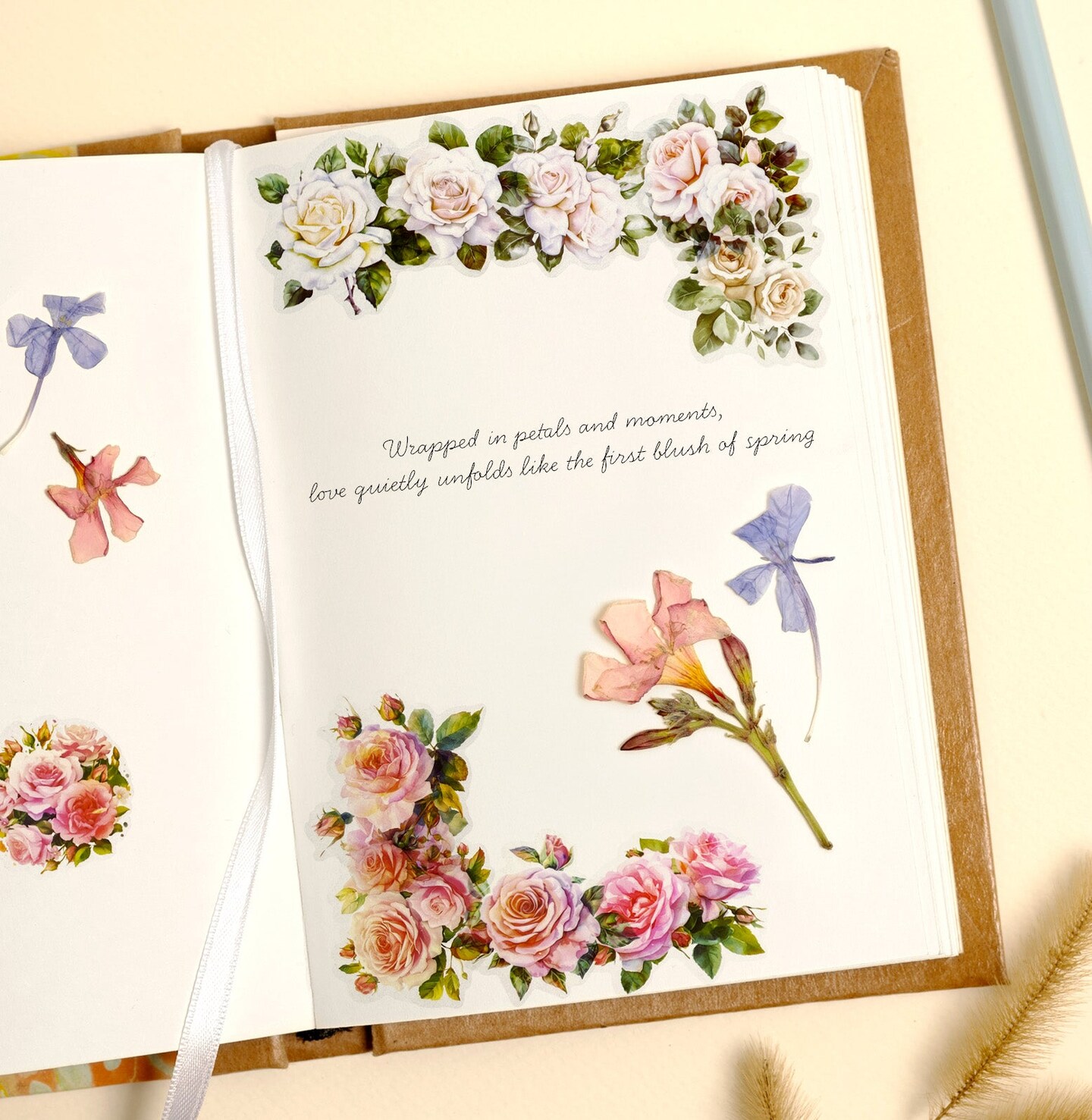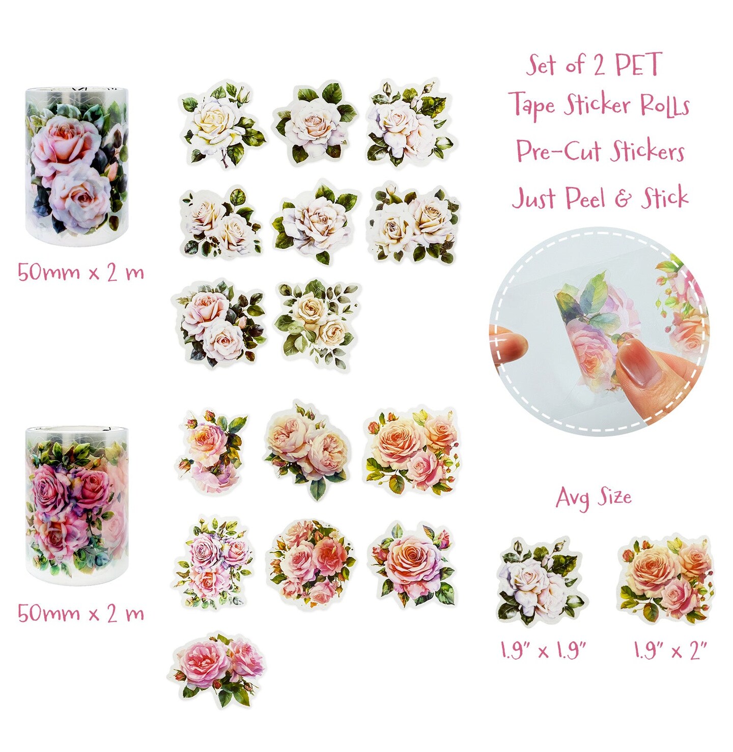 Wrapables Romantic Floral PET Tape, Pre-Cut Stickers for Scrapbooking, Stationery, Journaling, Diary, Card Making (Set of 2), Ivory and Pink
