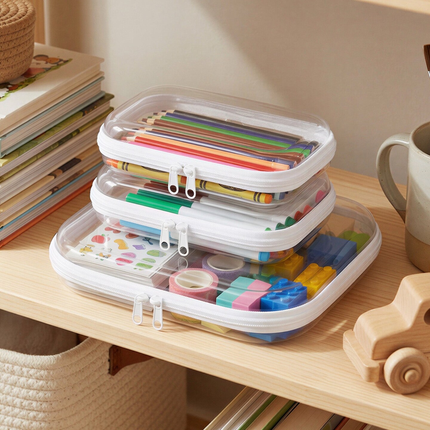 Wrapables Transparent Hard Shell Zipper Case, Clear Travel Storage Organizer for Snacks, Toiletries, Makeup, and Cosmetics (Set of 3), MSS