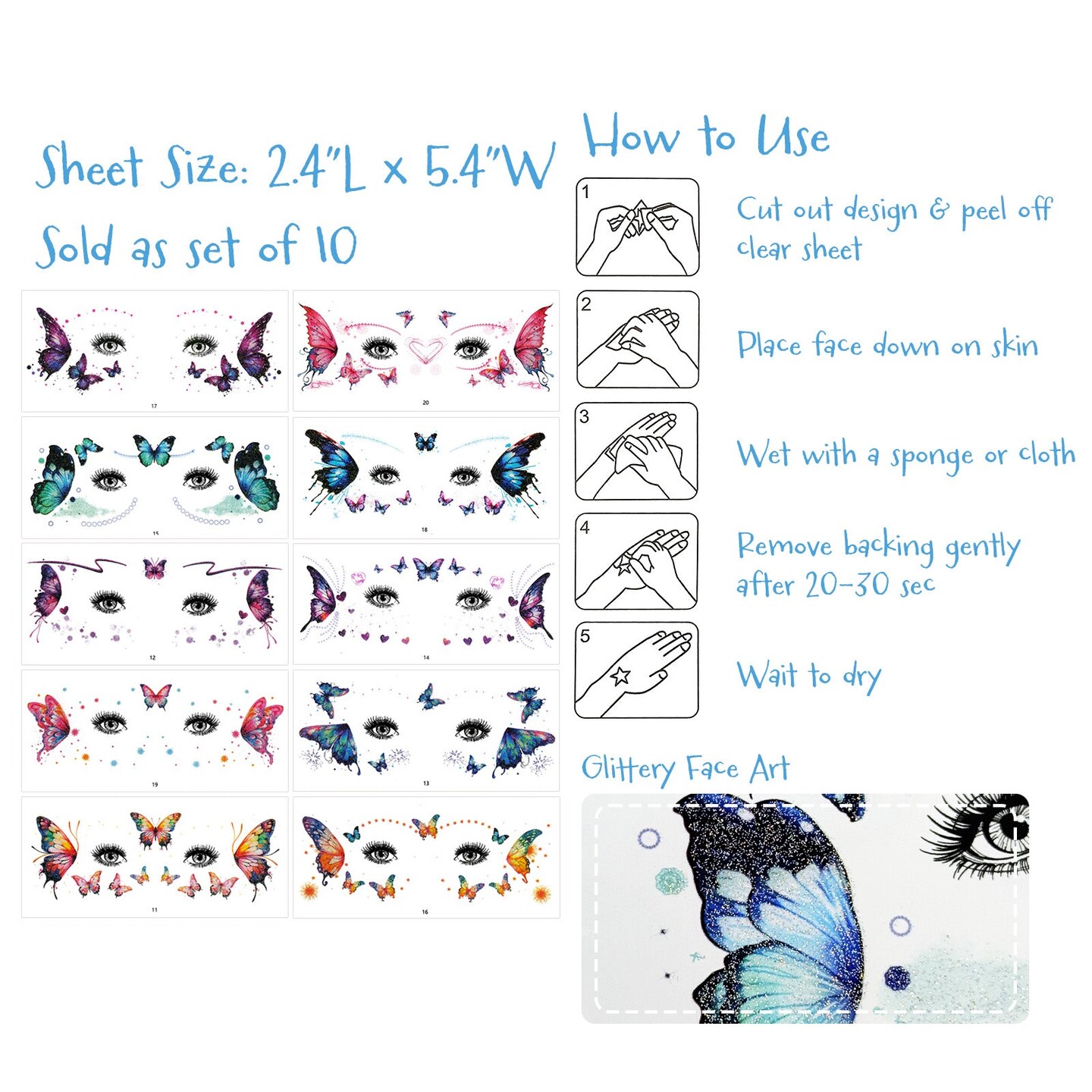 Wrapables Waterproof Glitter Butterfly Temporary Face Tattoos for Women, Eye and Facial Makeup for Parties, Beach, Festivals (10 Sheets)