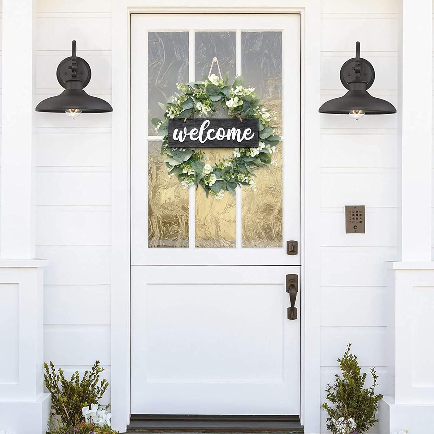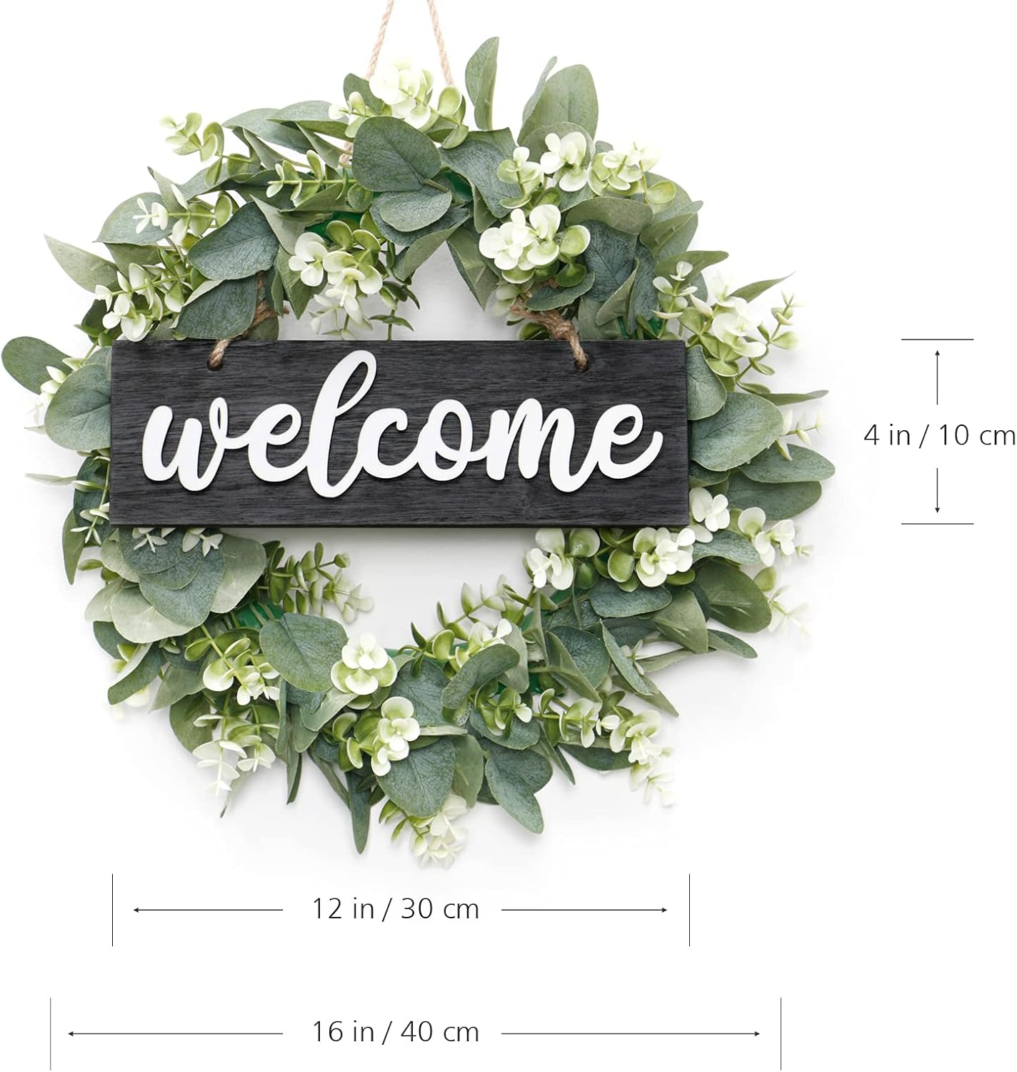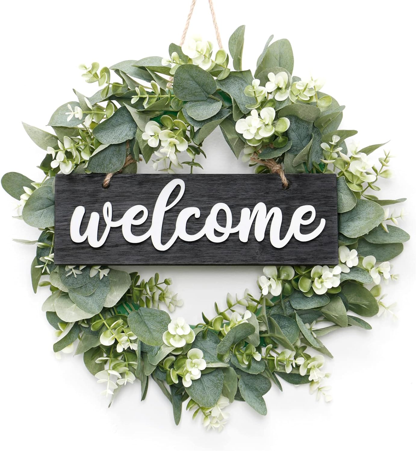Wreath for Front Door 16 Inch Eucalyptus Leaves Wreath Green Leaves Wreath with Welcome Sign Door Wreath Spring Summer Wreath for Farmhouse Home Porch Indoor Outdoor Decor (Black)