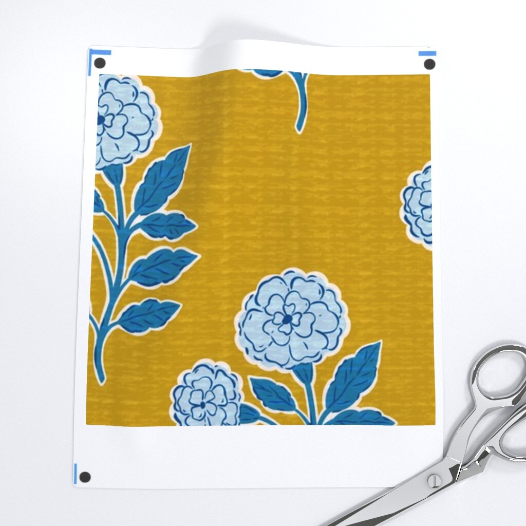 Yellow Floral Blue Block Print Marigold Flowers Hand Drawn Modern Botanical Faux Texture Custom Printed Fabric by Spoonflower Various Fabrics by the Yard or Fat Quarter