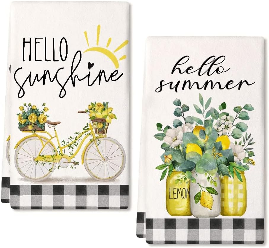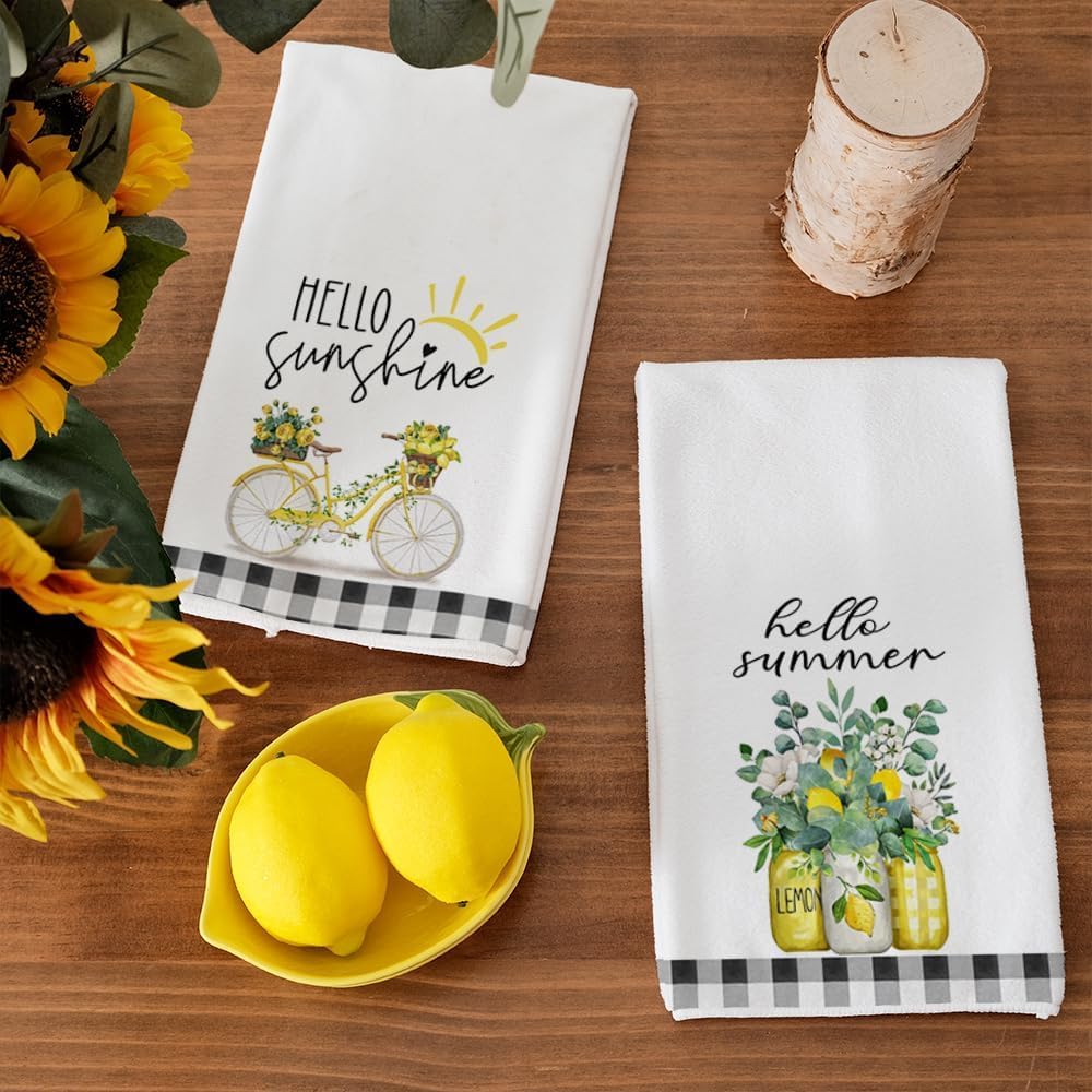 Yellow Lemon Eucalyptus Summer Kitchen Towels Dish Towels Set of 2,Black Bike Hello Summer Hand Towels 18x26 Inch Drying Dishcloth