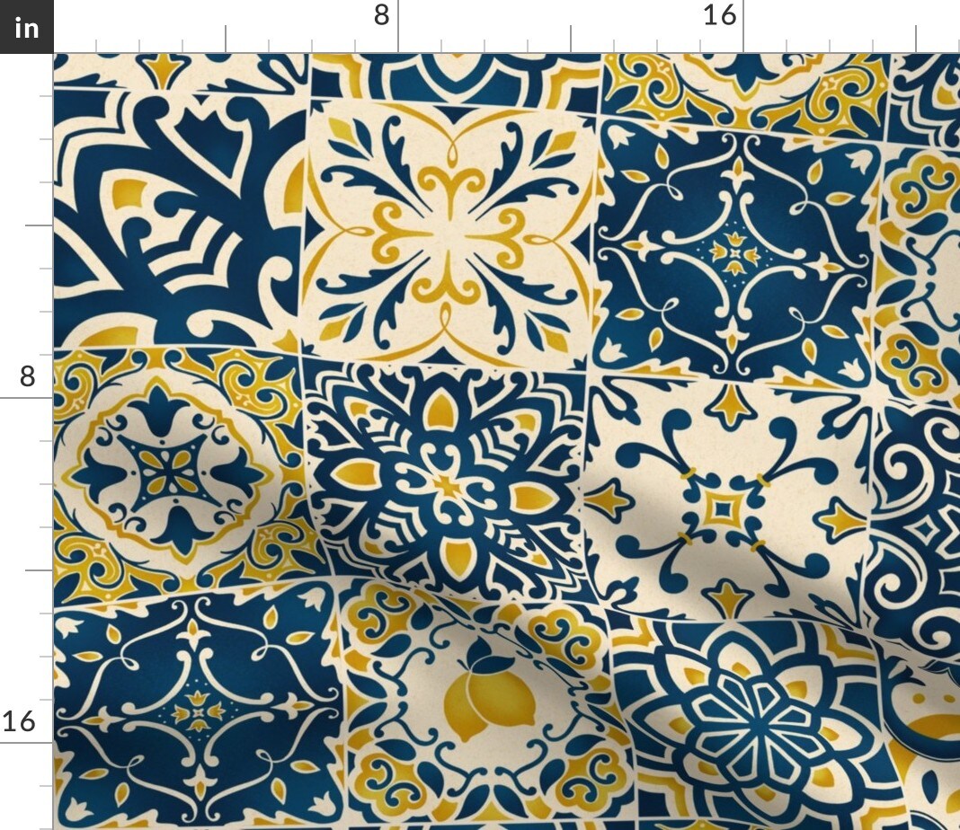 Yellow Tiles Lemons Cheater Quilt Italian Mediterranean Azulejos Sicilian Karge Scale Tuscan Custom Printed Fabric by Spoonflower Various Fabrics by the Yard or Fat Quarter